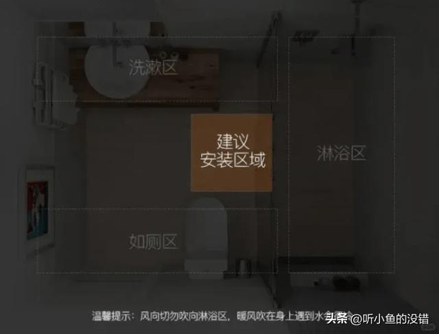 正确位置是装在干区,通过空气循环加热整个卫生间,洗澡时暖和又舒服,不会有冷风直吹的不适感。
