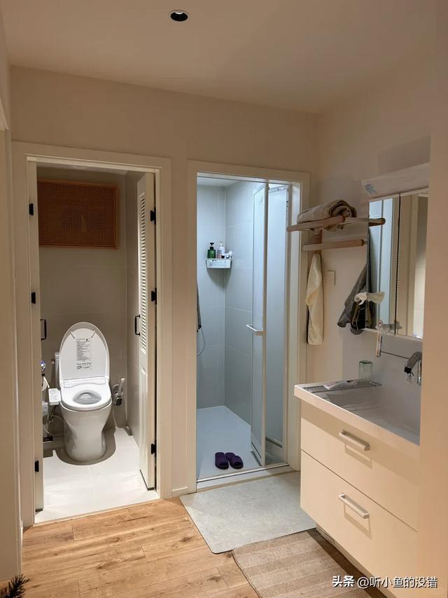 如果你家卫生间面积不算小,长度超过2米,强烈建议直接做三分离:把淋浴、马桶、洗手台三个区域,用墙体或玻璃门彻底分开。