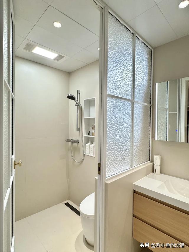 好处特别实在:早上家人不用抢卫生间,有人洗澡、有人刷牙互不耽误;而且水汽完全锁在淋浴区,外面柜子、马桶区域长期干爽,浴室柜不容易受潮发霉,日常打扫也轻松很多。
